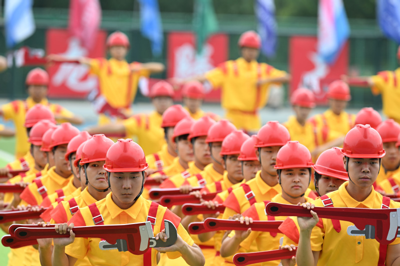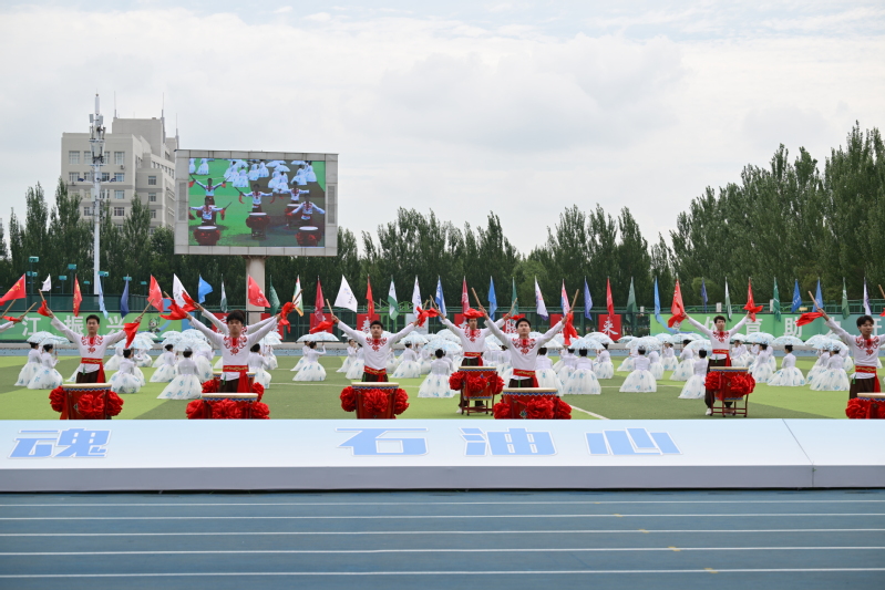大地深处奔涌着黑色的火焰,160名“石油工人”以身躯为钻机,扳手铿锵叩击岩层,泥浆翻腾如地脉呼吸。机械律动的手臂是拓荒的森林,油污斑驳的工装化作荣耀勋章。铁人誓言在钢铁碰撞中铮铮回响,“他们俯身挖掘大地的恩赐,只为黑色的金子在龙江大地上熠熠生辉”。《石油心·地火涌》作为筋骨篇章,准确诠释了大庆精神、铁人精神的时代价值。