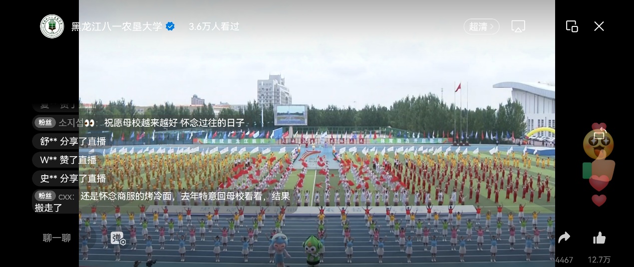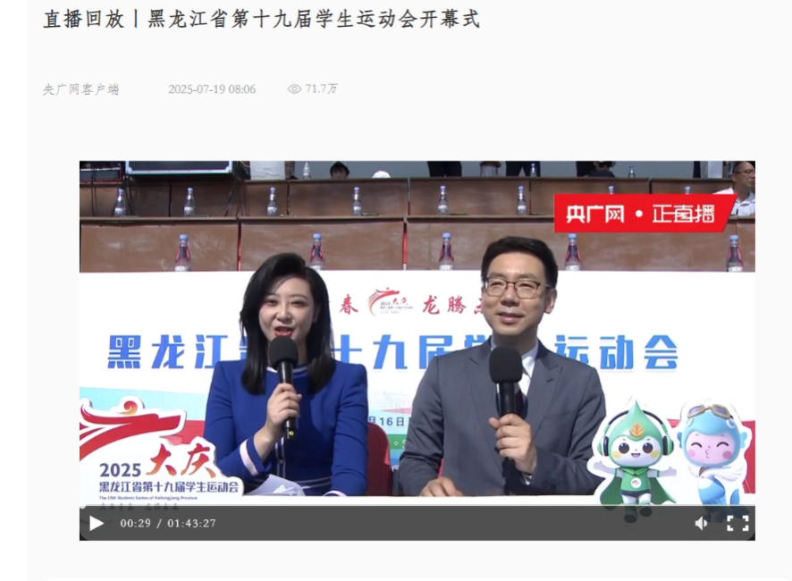 黑龙江广播电视台进行了现场直播,龙视新闻快手号、抖音号点击量达44.2万;央广网同步直播,实时收视峰值直接突破71.7万人次,评论区被点赞刷屏;大庆广播电视台«绝对现场»视频号、快手号、抖音号、进行转播,观看人次近13万;学校视频号、抖音号、新浪微博直播观看人次近9万人次,全网平台破百万人在线观看。