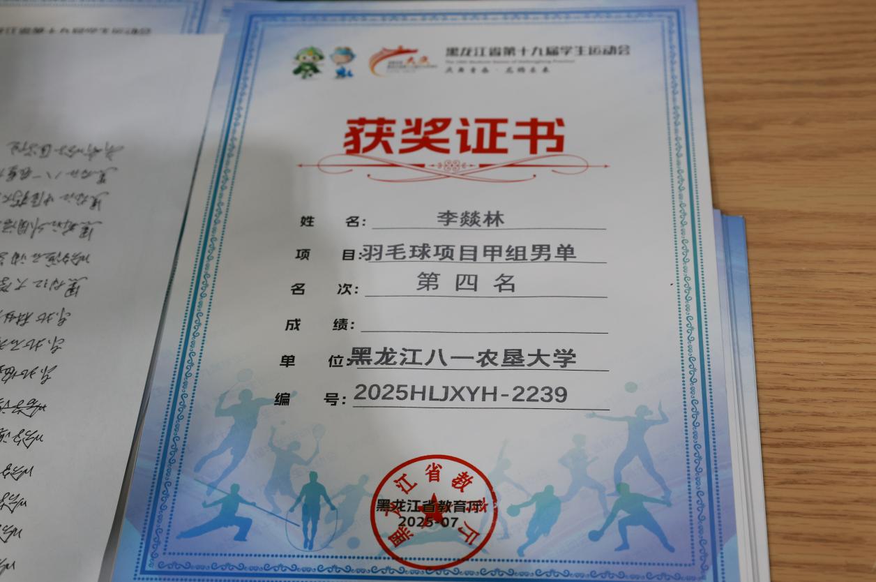 在黑龙江省第十九届学生运动会7月19日羽毛球赛的男单决赛赛场上,黑龙江八一农垦大学男单选手李燚林取得了男子单打项目第四名的优异成绩,为八一农大羽毛球项目成绩再添新篇章!