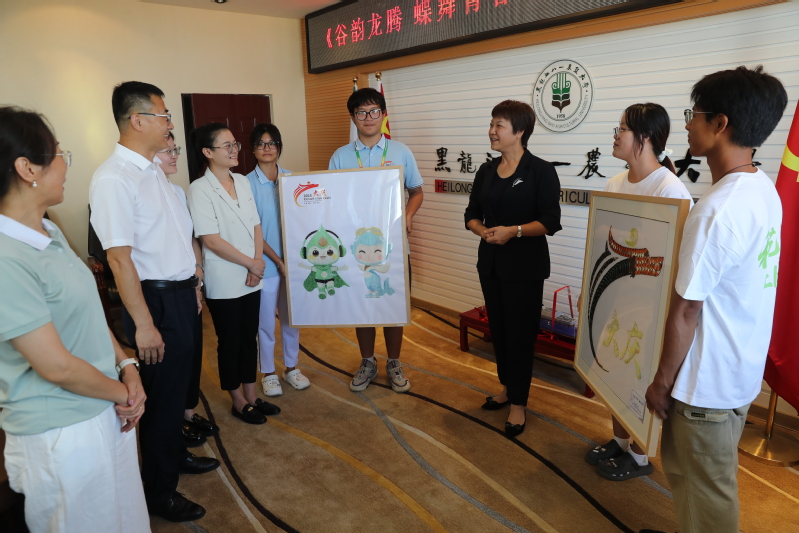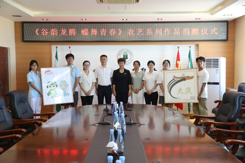 在黑龙江省第十九届学生运动会胜利召开之际,7月28日,学校在主楼928会议室举行《谷韵龙腾 蝶舞青春》农艺系列作品捐赠仪式。该系列作品由农学院种艺美育社团与植物保护协会联合创作。校长李翠霞,学校党委常委、宣传部(统战部)部长杨艳秋,农学院党委书记姜楠、系列作品指导教师杜艳丽、陈佳欢以及社团学生代表出席活动。